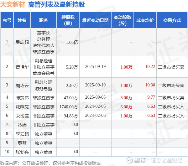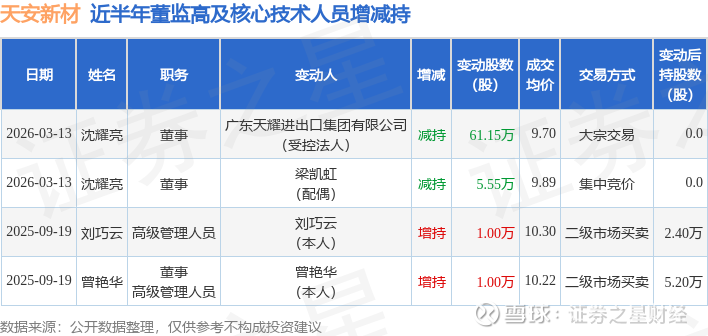 天安新材近半年内的董监高及核心技术人员增减持详情如下: