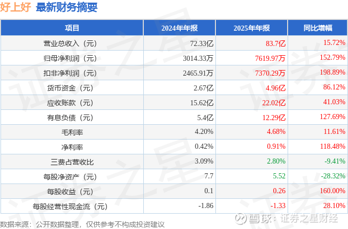 据证券之星公开数据整理,近期好上好(001298)发布2025年年报。截至本报告期末,公司营业总收入83.7亿元,同比上升15.72%,归母净利润7619.97万元,同比上升152.79%。按单季度数据看,第四季度营业总收入22.42亿元,同比上升19.29%,第四季度归母净利润2705.39万元,同比上升16246.53%。本报告期好上好应收账款上升,应收账款同比增幅达41.03%。