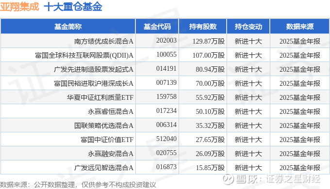 持有亚翔集成最多的基金为南方绩优成长混合A,目前规模为43.52亿元,最新净值1.092(3月13日),较上一交易日下跌0.32%,近一年上涨32.34%。该基金现任基金经理为史博。