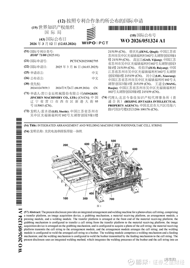 证券之星消息,根据企查查数据显示金辰股份(603396)公布了一项国际专利申请,专利名为“光伏电池串排版焊接一体机”,专利申请号为PCT/CN2025/082795,国际公布日为2026年3月12日。