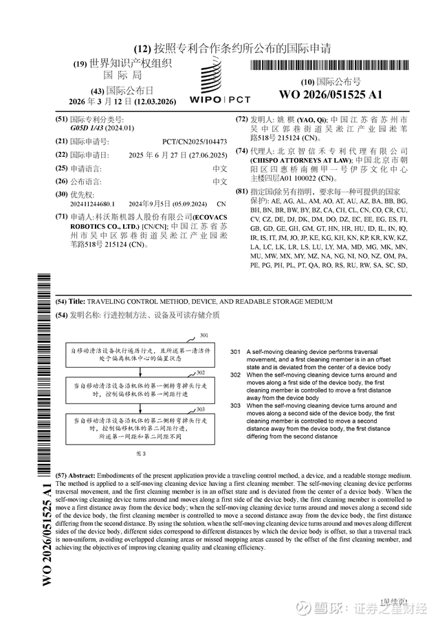 证券之星消息,根据企查查数据显示科沃斯(603486)公布了一项国际专利申请,专利名为“行进控制方法、设备及可读存储介质”,专利申请号为PCT/CN2025/104473,国际公布日为2026年3月12日。