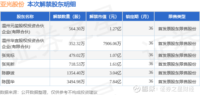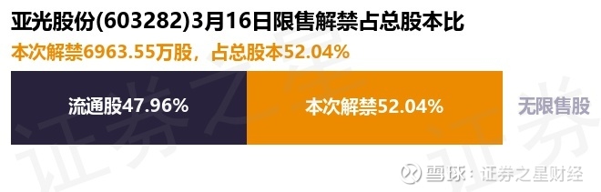 证券之星消息,根据市场公开信息整理,亚光股份(603282)于3月16日将有6963.55万股限售股份解禁,为公司首发原股东限售股份,占公司总股本52.04%。(本次数据根据历史公告整理得出,实际情况以上市公司最新公告为准)本次解禁后,公司已无限售股份。具体如下图所示: