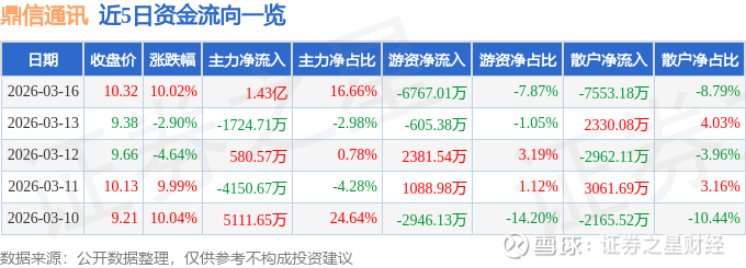 证券之星消息,鼎信通讯3月16日涨停收盘,收盘价10.32元。该股于9点58分涨停,1次打开涨停,截止收盘封单资金为3163.99万元,占其流通市值0.47%。