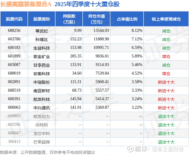 根据2025基金年报公募基金重仓股数据,重仓该股的公募基金共32家,其中持有数量最多的公募基金为长盛基金的长盛高端装备混合A。长盛高端装备混合A目前规模为11.9亿元,最新净值4.972(3月13日),较上一交易日下跌1.02%,近一年上涨40.65%。该公募基金现任基金经理为郭堃。郭堃在任的基金产品包括:长盛同盛成长优选(LOF),管理时间为2020年5月27日至今,期间收益率为97.2%;长盛制造精选混合A,管理时间为2020年8月26日至今,期间收益率为40.64%;长盛同德主题混合,管理时间为2021年1月7日至今,期间收益率为4.26%;长盛优势企业精选混合A,管理时间为2021年2月2日至今,期间收益率为-5.26%。