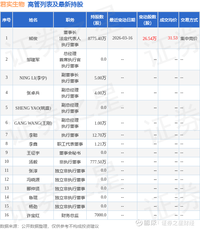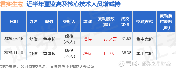 证券之星消息,根据3月16日市场公开信息、上市公司公告及交易所披露数据整理,君实生物(688180)最新董监高及相关人员股份变动情况:2026年3月16日公司董事长熊俊共增持公司股份26.54万股,占公司总股本为0.0258%。变动期间公司股价上涨1.77%,3月16日当日收盘报31.55元。