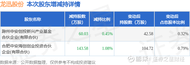 证券之星消息,3月16日龙迅股份发布公告《龙迅股份:龙迅股份股东减持计划期限届满暨减持股份结果公告》,其股东滁州中安创投新兴产业基金合伙企业(有限合伙)、合肥中安海创创业投资合伙企业(有限合伙)于2026年1月14日至2026年2月27日间合计减持203.61万股,占公司目前总股本的1.5272%,变动期间该股股价下跌1.14%,截止2月27日收盘报77.48元。