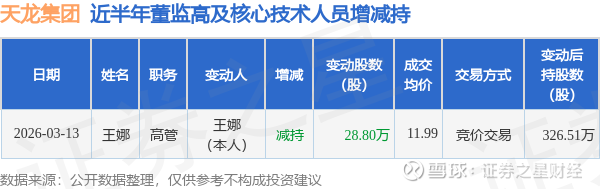 证券之星消息,根据3月16日市场公开信息、上市公司公告及交易所披露数据整理,天龙集团(300063)最新董监高及相关人员股份变动情况:2026年3月13日公司高管王娜共减持公司股份28.8万股,占公司总股本为0.038%。变动期间公司股价下跌3.22%,3月13日当日收盘报11.71元。