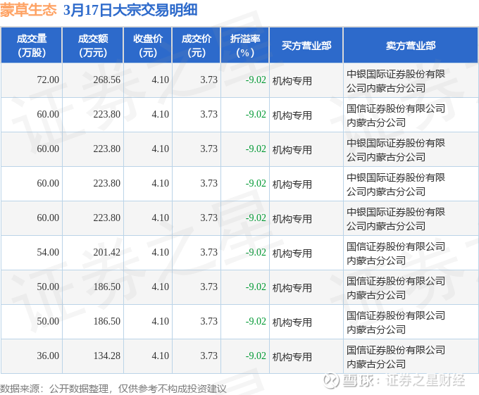 证券之星消息,3月17日蒙草生态发生大宗交易,交易数据如下: