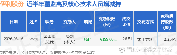 证券之星消息,根据3月17日市场公开信息、上市公司公告及交易所披露数据整理,伊利股份(600887)最新董监高及相关人员股份变动情况:2026年3月16日公司董事长,总裁潘刚共减持公司股份6199.03万股,占公司总股本为0.98%。变动期间公司股价上涨0.49%,3月16日当日收盘报26.84元。