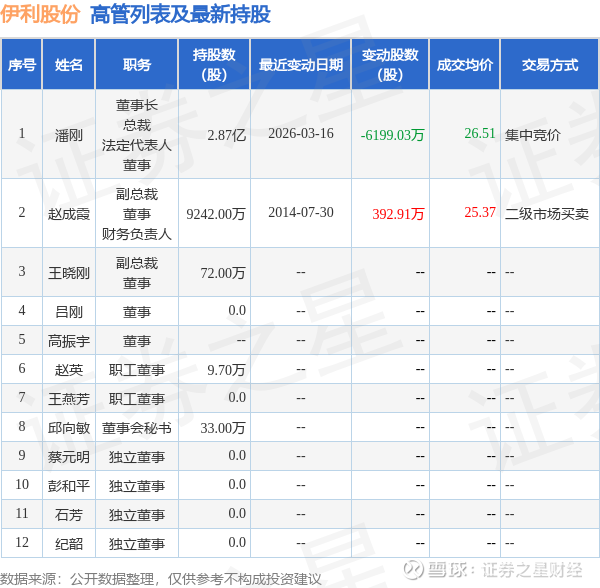 伊利股份近半年内的董监高及核心技术人员增减持详情如下: