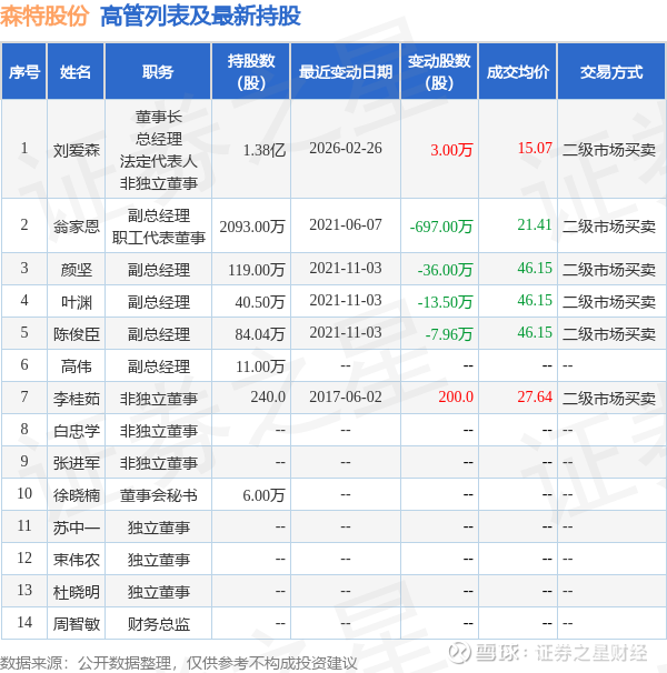 森特股份的高管列表及最新持股情况如下: