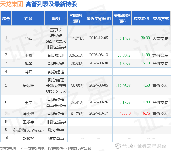 天龙集团近半年内的董监高及核心技术人员增减持详情如下: