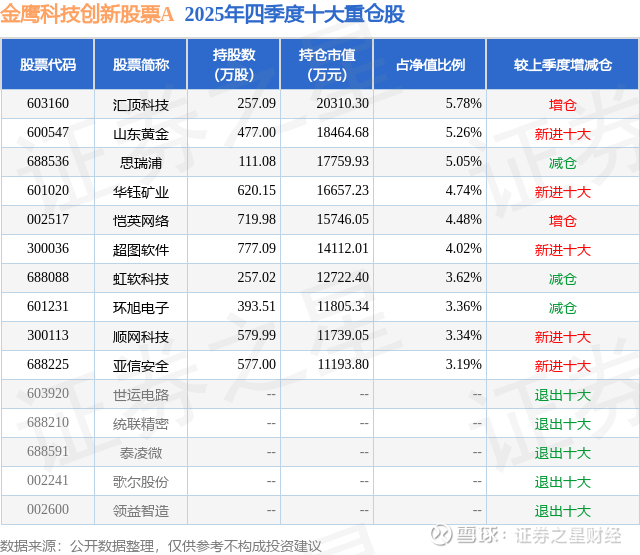 金鹰科技创新股票A的前十大重仓股如下: