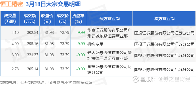 证券之星消息,3月18日恒工精密发生大宗交易,交易数据如下: