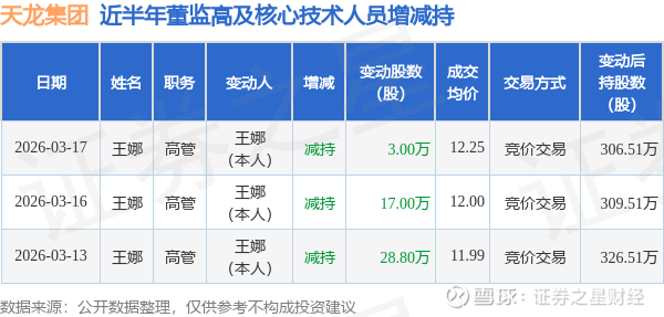 证券之星消息,根据3月18日市场公开信息、上市公司公告及交易所披露数据整理,天龙集团(300063)最新董监高及相关人员股份变动情况:2026年3月17日公司高管王娜共减持公司股份3.0万股,占公司总股本为0.004%。变动期间公司股价下跌1.65%,3月17日当日收盘报11.92元。