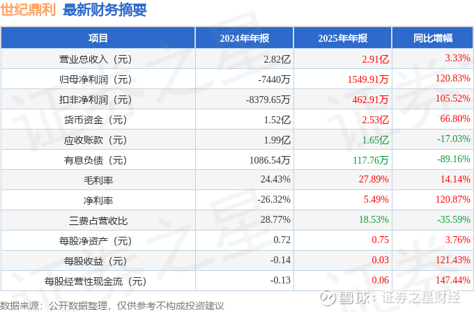 据证券之星公开数据整理,近期世纪鼎利(300050)发布2025年年报。截至本报告期末,公司营业总收入2.91亿元,同比上升3.33%,归母净利润1549.91万元,同比上升120.83%。按单季度数据看,第四季度营业总收入1.06亿元,同比上升40.6%,第四季度归母净利润5.82万元,同比上升100.11%。本报告期世纪鼎利盈利能力上升,毛利率同比增幅14.14%,净利率同比增幅120.87%。