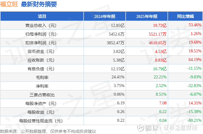据证券之星公开数据整理,近期福立旺(688678)发布2025年年报。截至本报告期末,公司营业总收入19.72亿元,同比上升53.46%,归母净利润5521.17万元,同比上升1.26%。按单季度数据看,第四季度营业总收入5.97亿元,同比上升54.82%,第四季度归母净利润2132.19万元,同比上升300.53%。本报告期福立旺应收账款上升,应收账款同比增幅达64.19%。