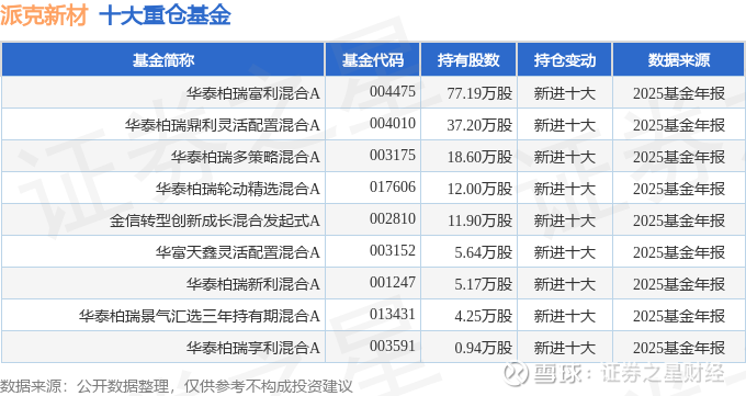 持有派克新材最多的基金为华泰柏瑞富利混合A,目前规模为28.81亿元,最新净值2.7874(3月18日),较上一交易日上涨0.11%,近一年上涨30.34%。该基金现任基金经理为董辰。
