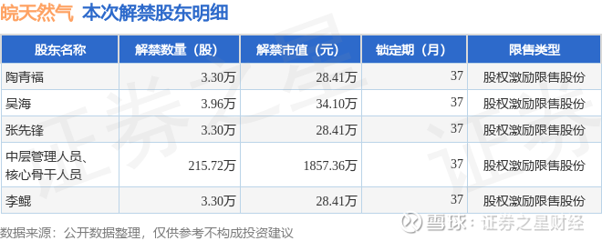 证券之星消息,根据市场公开信息整理,皖天然气(603689)于3月19日将有229.58万股限售股份解禁,为公司股权激励限售股份,占公司总股本0.44%。(本次数据根据历史公告整理得出,实际情况以上市公司最新公告为准)本次解禁后,公司还有236.54万股限售股份,占总股本0.45%。具体如下图所示: