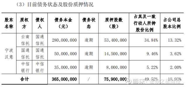 值得注意的是,除了上述2.8亿元的核心债务外,宁波汉意及其一致行动人还面临着其他到期债务的挤压。公告显示,宁波汉意另对国通信托负有5000万元逾期债务,并对中信银行负有3500万元逾期债务。这三笔逾期债务本金合计高达3.65亿元。