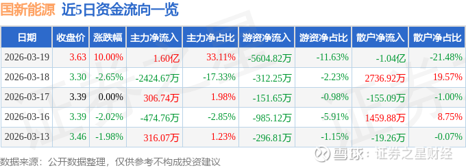 证券之星消息,国新能源3月19日涨停收盘,收盘价3.63元。该股于10点27分涨停,1次打开涨停,截止收盘封单资金为7789.75万元,占其流通市值1.21%。