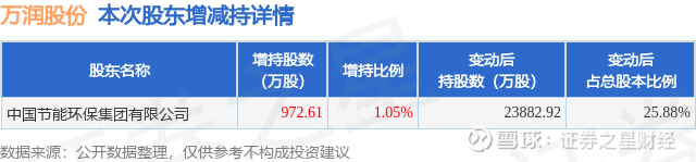 证券之星消息,3月19日万润股份发布公告《万润股份:关于控股股东、实际控制人增持公司股份权益变动触及1%整数倍暨增持计划进展情况的公告》,其股东中国节能环保集团有限公司于2026年2月12日至2026年3月19日间合计增持972.61万股,占公司目前总股本的1.0538%,变动期间该股股价下跌7.45%,截止3月19日收盘报15.53元。