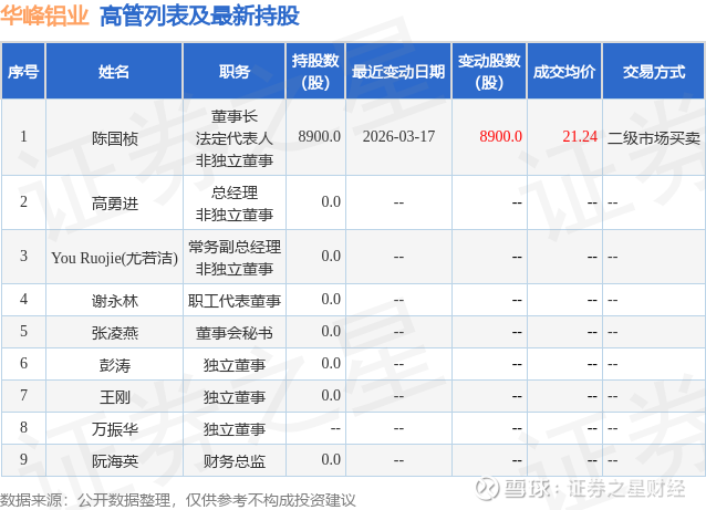华峰铝业的高管列表及最新持股情况如下: