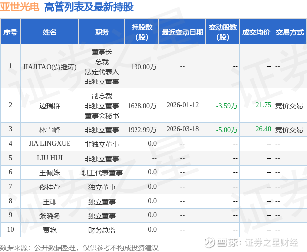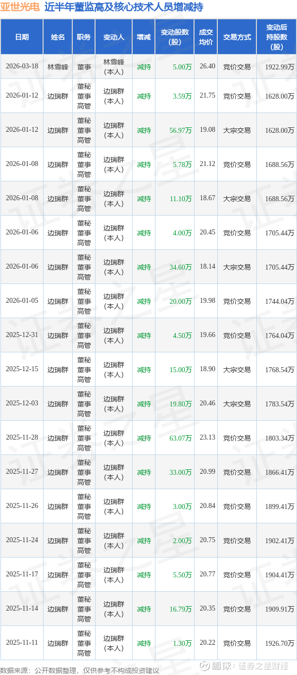 亚世光电近半年内的董监高及核心技术人员增减持详情如下:
