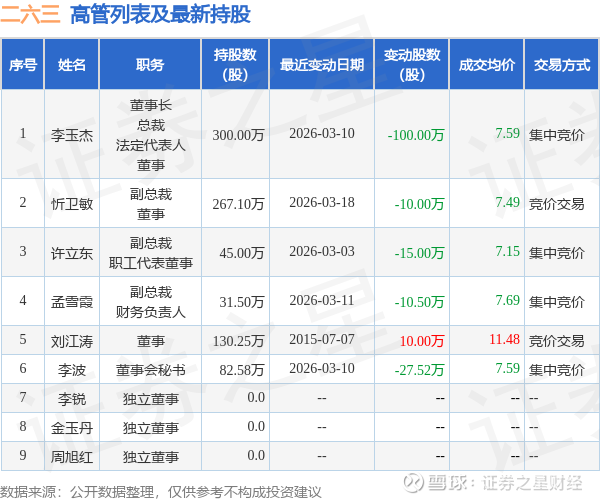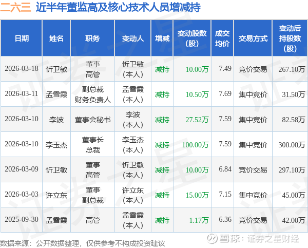 证券之星消息,根据3月19日市场公开信息、上市公司公告及交易所披露数据整理,二六三(002467)最新董监高及相关人员股份变动情况:2026年3月18日公司董事,高管忻卫敏共减持公司股份10.0万股,占公司总股本为0.0073%。变动期间公司股价上涨3.43%,3月18日当日收盘报7.54元。