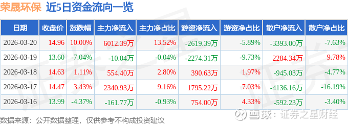 证券之星消息,荣晟环保3月20日涨停收盘,收盘价14.96元。该股于10点7分涨停,1次打开涨停,截止收盘封单资金为2400.5万元,占其流通市值0.53%。