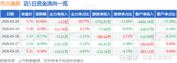 证券之星消息,市北高新3月20日涨停收盘,收盘价5.7元。该股于13点19分涨停,2次打开涨停,截止收盘封单资金为2030.78万元,占其流通市值0.25%。