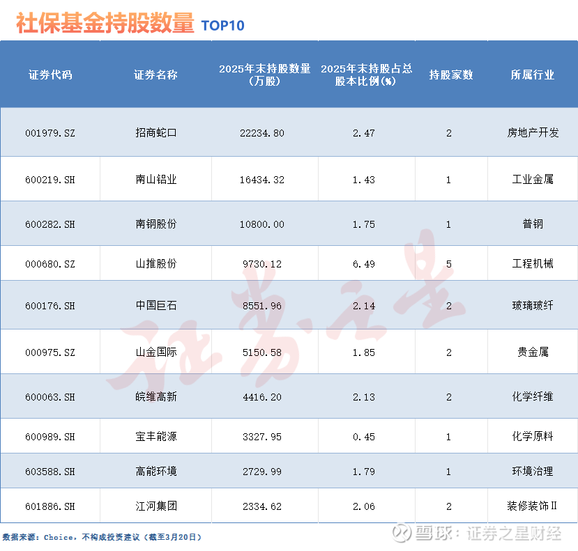 据Choice数据,截至3月20日,在已披露2025年年报的130余家A股公司中,社保基金的身影出现在了36家公司的前十大流通股股东名单之中,其最新的持仓结构呈现出“稳字当头、适度求进”的特点。