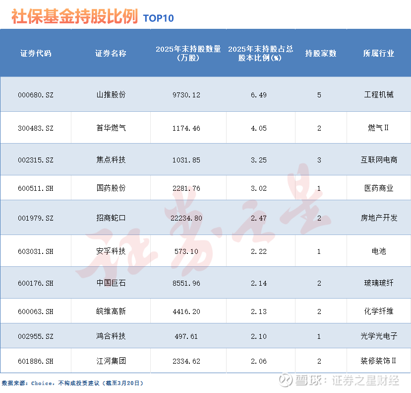 除上述三家公司外,进入社保基金重仓视野的还有山推股份、中国巨石、山金国际、皖维高新、宝丰能源、高能环境、江河集团。这些公司广泛分布在工程机械、建材、黄金、化工、环保及建筑装饰等领域,普遍具备行业地位稳固、经营现金流良好、分红预期稳定的特点。