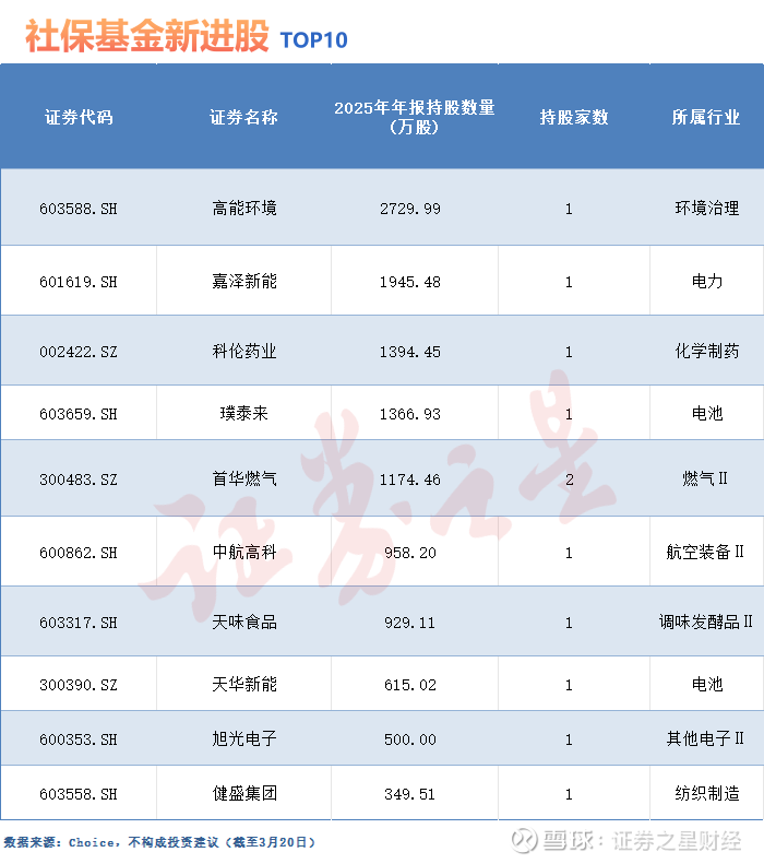 在新进个股中,高能环境的持股数量位居榜首。截至2025年末,社保基金持有近2730万股高能环境,为其第六大流通股股东。公司核心业务涵盖固废危废资源化利用、生活垃圾处理、环境修复等领域,同时兼顾固废危废无害化处置、水处理、大气污染治理、有机垃圾治理等多元业务。社保基金此时大举建仓,或许正是看中了其在土壤修复、危废处置等领域的技术壁垒及未来业绩释放的潜力。