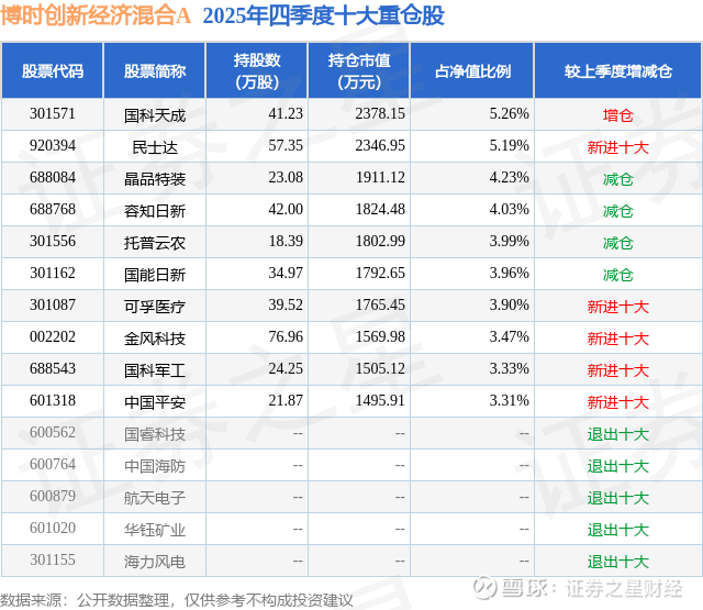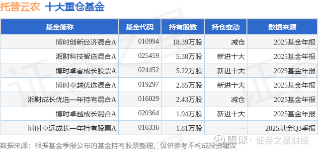 根据2025基金年报公募基金重仓股数据,重仓该股的公募基金共6家,其中持有数量最多的公募基金为博时基金的博时创新经济混合A。博时创新经济混合A目前规模为3.7亿元,最新净值1.4941(3月19日),较上一交易日下跌1.64%,近一年上涨41.7%。该公募基金现任基金经理为田俊维。田俊维在任的基金产品包括:博时卓睿成长股票A,管理时间为2025年6月20日至今,期间收益率为10.86%;博时卓越优选混合A,管理时间为2025年6月27日至今,期间收益率为7.91%。