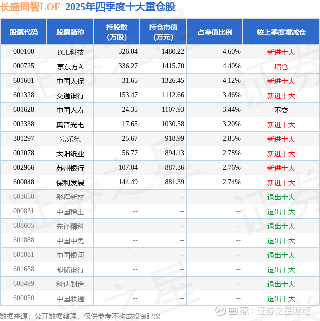 长盛同智LOF的前十大重仓股如下: