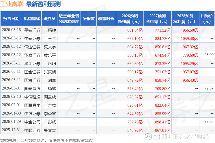 最新盈利预测明细如下: