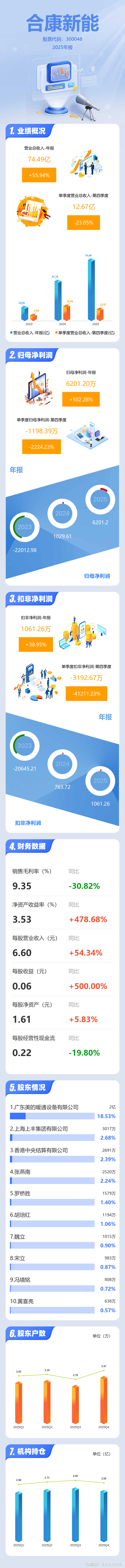 证券之星消息,合康新能2025年年报显示,当年度公司主营收入74.49亿元,同比上升55.95%;归母净利润6201.2万元,同比上升502.28%;扣非净利润1061.26万元,同比上升38.96%;其中2025年第四季度,公司单季度主营收入12.67亿元,同比下降23.85%;单季度归母净利润-1198.39万元,同比下降2224.23%;单季度扣非净利润-3192.67万元,同比下降41211.23%;负债率61.58%,投资收益2652.45万元,财务费用-959.63万元,毛利率9.35%。