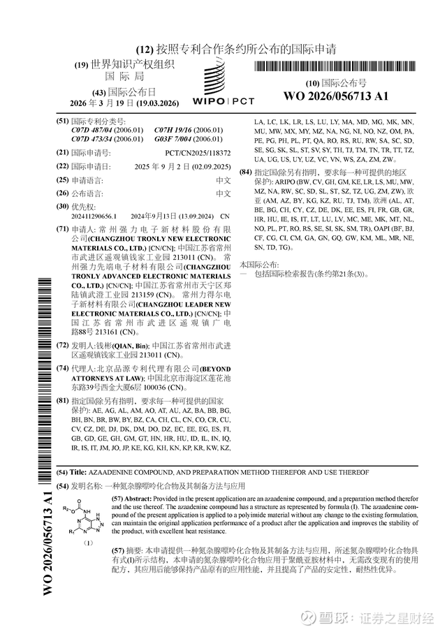 证券之星消息,根据企查查数据显示强力新材(300429)公布了一项国际专利申请,专利名为“一种氮杂腺嘌呤化合物及其制备方法与应用”,专利申请号为PCT/CN2025/118372,国际公布日为2026年3月19日。