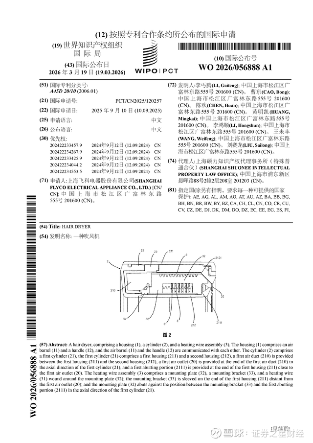 证券之星消息,根据企查查数据显示飞科电器(603868)公布了一项国际专利申请,专利名为“一种吹风机”,专利申请号为PCT/CN2025/120257,国际公布日为2026年3月19日。