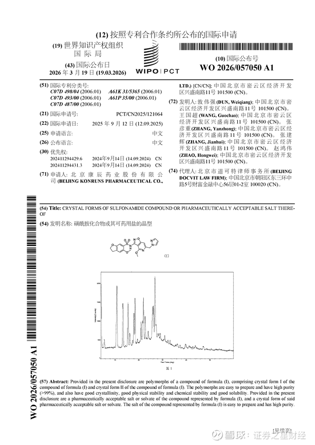 证券之星消息,根据企查查数据显示康辰药业(603590)公布了一项国际专利申请,专利名为“磺酰胺化合物或其可药用盐的晶型”,专利申请号为PCT/CN2025/121064,国际公布日为2026年3月19日。