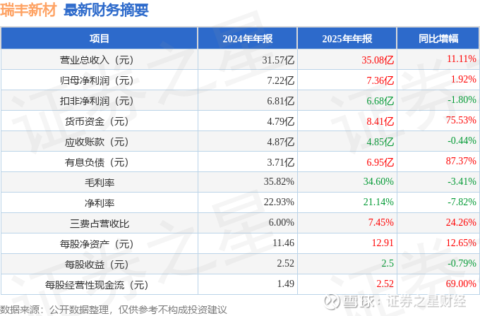 据证券之星公开数据整理,近期瑞丰新材(300910)发布2025年年报。根据财报显示,瑞丰新材营收净利润同比双双增长。截至本报告期末,公司营业总收入35.08亿元,同比上升11.11%,归母净利润7.36亿元,同比上升1.92%。按单季度数据看,第四季度营业总收入9.58亿元,同比上升11.76%,第四季度归母净利润1.62亿元,同比下降27.14%。