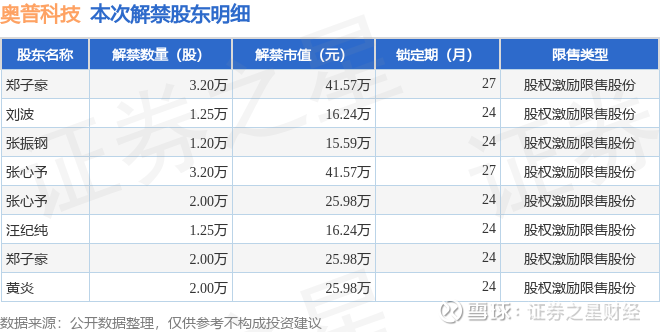 证券之星消息,根据市场公开信息整理,奥普科技(603551)于3月23日将有16.1万股限售股份解禁,为公司股权激励限售股份,占公司总股本0.04%。(本次数据根据历史公告整理得出,实际情况以上市公司最新公告为准)最近一年内,该股累计解禁101.86万股,占总股本的0.26%。本次解禁后,公司还有485.9万股限售股份,占总股本1.26%。具体如下图所示: