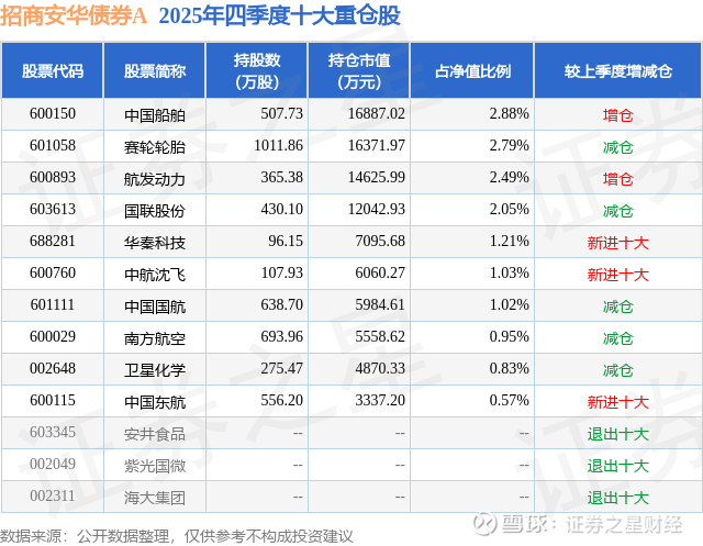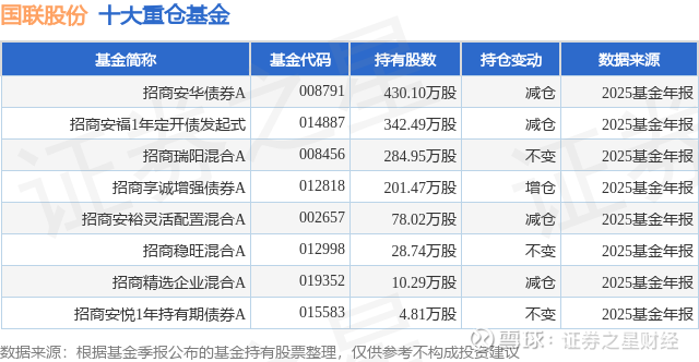 根据2025基金年报公募基金重仓股数据,重仓该股的公募基金共8家,其中持有数量最多的公募基金为招商基金的招商安华债券A。招商安华债券A目前规模为44.0亿元,最新净值1.2621(3月20日),较上一交易日下跌0.53%,近一年上涨3.19%。该公募基金现任基金经理为王娟娟 王刚。王刚在任的基金产品包括:招商瑞丰灵活配置混合发起式A,管理时间为2017年7月28日至今,期间收益率为75.86%;招商丰美混合A,管理时间为2017年7月28日至今,期间收益率为85.33%;招商享诚增强债券A,管理时间为2021年10月26日至今,期间收益率为21.07%;招商安鼎平衡1年持有期混合A,管理时间为2022年3月21日至今,期间收益率为26.61%。王娟娟在任的基金产品包括:招商招悦纯债A,管理时间为2021年12月31日至今,期间收益率为16.93%;招商安本增利债券A,管理时间为2022年1月14日至今,期间收益率为26.38%;招商享利增强债券A,管理时间为2022年2月24日至今,期间收益率为7.28%。