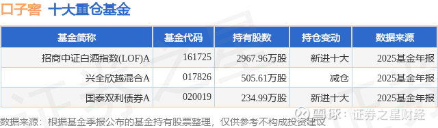 根据2025基金年报公募基金重仓股数据,重仓该股的公募基金共3家,其中持有数量最多的公募基金为招商基金的招商中证白酒指数(LOF)A。招商中证白酒指数(LOF)A目前规模为284.95亿元,最新净值0.6519(3月20日),较上一交易日下跌0.76%,近一年下跌22.93%。该公募基金现任基金经理为侯昊。侯昊在任的基金产品包括:招商中证银行指数A,管理时间为2017年9月5日至今,期间收益率为73.07%;招商国证生物医药指数(LOF)A,管理时间为2017年9月5日至今,期间收益率为-8.53%;招商中证消费龙头指数增强A,管理时间为2021年5月25日至今,期间收益率为-20.76%。