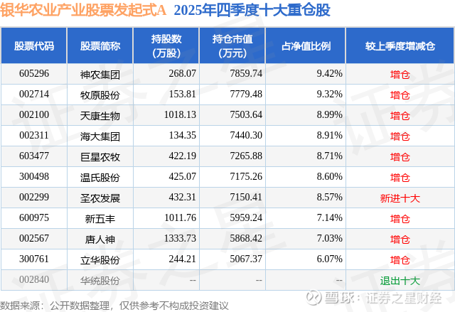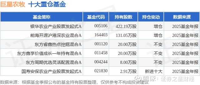 根据2025基金年报公募基金重仓股数据,重仓该股的公募基金共6家,其中持有数量最多的公募基金为银华基金的银华农业产业股票发起式A。银华农业产业股票发起式A目前规模为4.07亿元,最新净值1.3131(3月20日),较上一交易日下跌0.83%,近一年上涨4.13%。该公募基金现任基金经理为唐能。唐能在任的基金产品包括:银华和谐主题混合,管理时间为2015年5月25日至今,期间收益率为34.45%;银华瑞泰灵活配置混合,管理时间为2018年12月27日至今,期间收益率为108.96%;银华科创主题灵活配置混合(LOF),管理时间为2019年7月5日至今,期间收益率为91.32%;银华科技创新混合A,管理时间为2020年1月16日至今,期间收益率为54.69%。