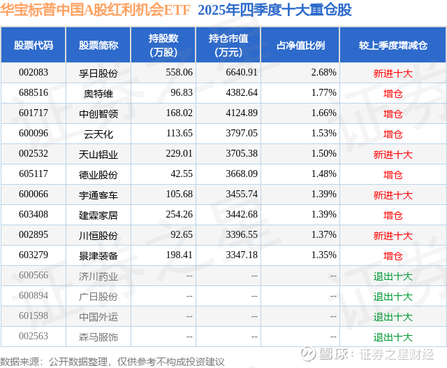 华宝标普中国A股红利机会ETF的前十大重仓股如下: