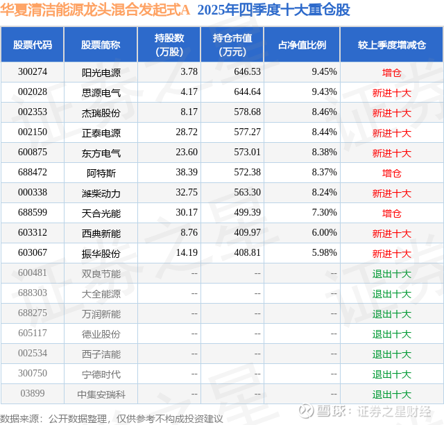 根据2025基金年报公募基金重仓股数据,重仓该股的公募基金共2家,其中持有数量最多的公募基金为华夏基金的华夏清洁能源龙头混合发起式A。华夏清洁能源龙头混合发起式A目前规模为0.26亿元,最新净值1.8116(3月20日),较上一交易日下跌0.28%,近一年上涨72.05%。该公募基金现任基金经理为时赟凯。时赟凯在任的基金产品包括:华夏新起点混合A,管理时间为2026年2月26日至今,期间收益率为-5.58%;华夏核心成长混合A,管理时间为2026年2月26日至今,期间收益率为-12.66%;