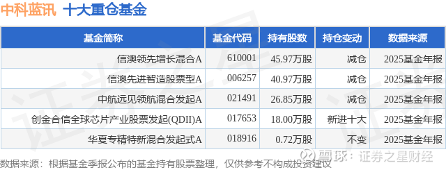 根据2025基金年报公募基金重仓股数据,重仓该股的公募基金共5家,其中持有数量最多的公募基金为信达澳亚基金的信澳领先增长混合A。信澳领先增长混合A目前规模为8.21亿元,最新净值1.5882(3月20日),较上一交易日下跌1.7%,近一年上涨4.43%。该公募基金现任基金经理为齐兴方。齐兴方在任的基金产品包括:信澳先进智造股票型A,管理时间为2022年11月14日至今,期间收益率为7.86%;信澳至诚精选混合A,管理时间为2025年10月29日至今,期间收益率为18.61%;信澳高端装备混合A,管理时间为2025年11月11日至今,期间收益率为-1.48%。