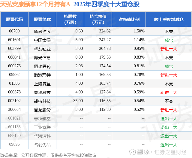 根据2025基金年报公募基金重仓股数据,重仓该股的公募基金共1家,其中持有数量最多的公募基金为天弘基金的天弘安康颐享12个月持有A。天弘安康颐享12个月持有A目前规模为2.06亿元,最新净值1.09(3月20日),较上一交易日下跌0.18%,近一年上涨3.45%。该公募基金现任基金经理为胡彧。胡彧在任的基金产品包括:天弘宁弘六个月A,管理时间为2023年7月6日至今,期间收益率为6.94%;天弘价值精选混合发起A,管理时间为2023年7月12日至今,期间收益率为8.82%;天弘惠利混合A,管理时间为2025年11月5日至今,期间收益率为1.36%。